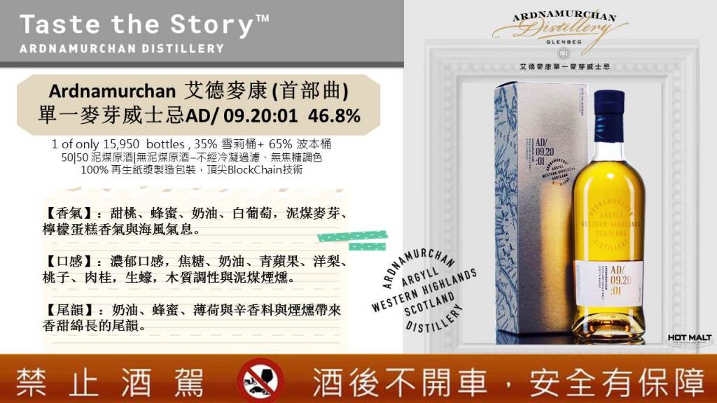 查理的鼻子一直為了酒廠做出了重要的建議與決定性的定位。」 取自艾德麥康單一麥芽威士忌官方粉絲專頁AD 09.20:01。全世界僅發行 15978 隻。採用各 50% 的泥煤麥芽和無泥煤麥芽。勾兌 35% 雪莉桶和 65% 波本桶。那究竟是甚麼風味呢!?不同於艾雷島、島嶼和高地區的泥煤風味,一種特殊的,類似拉佛格,帶有青草風味的清新泥煤,又有些類似 Ardmore,有些燒乾草的煙燻風味。帶有 Clynelish 和 Bora 的蜜香、蠟質感。半島特有風格,帶有些許鹹味。