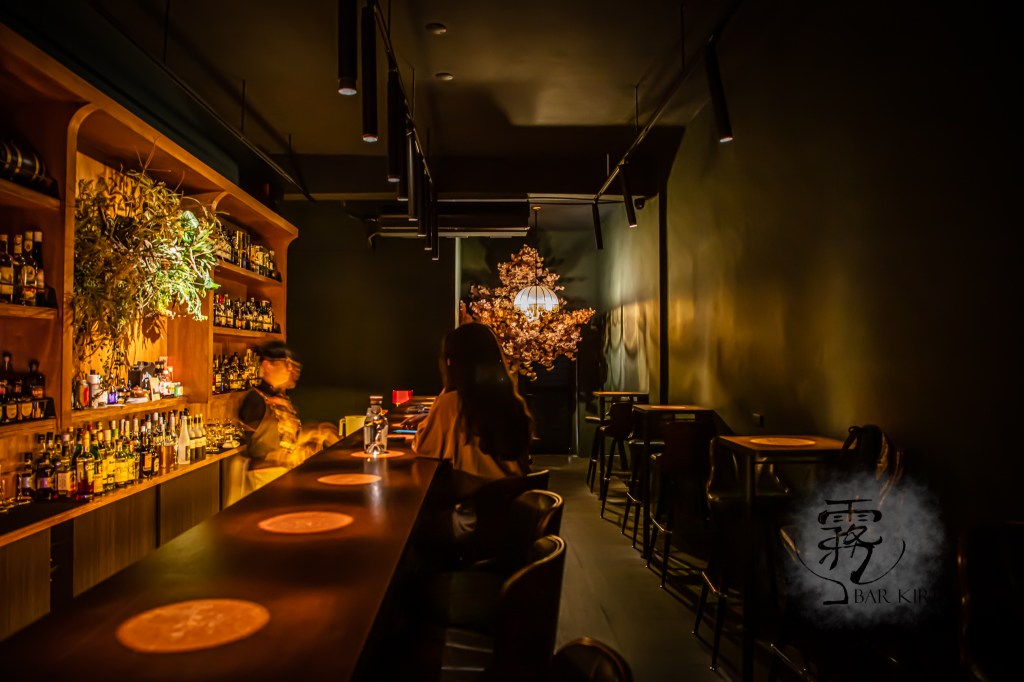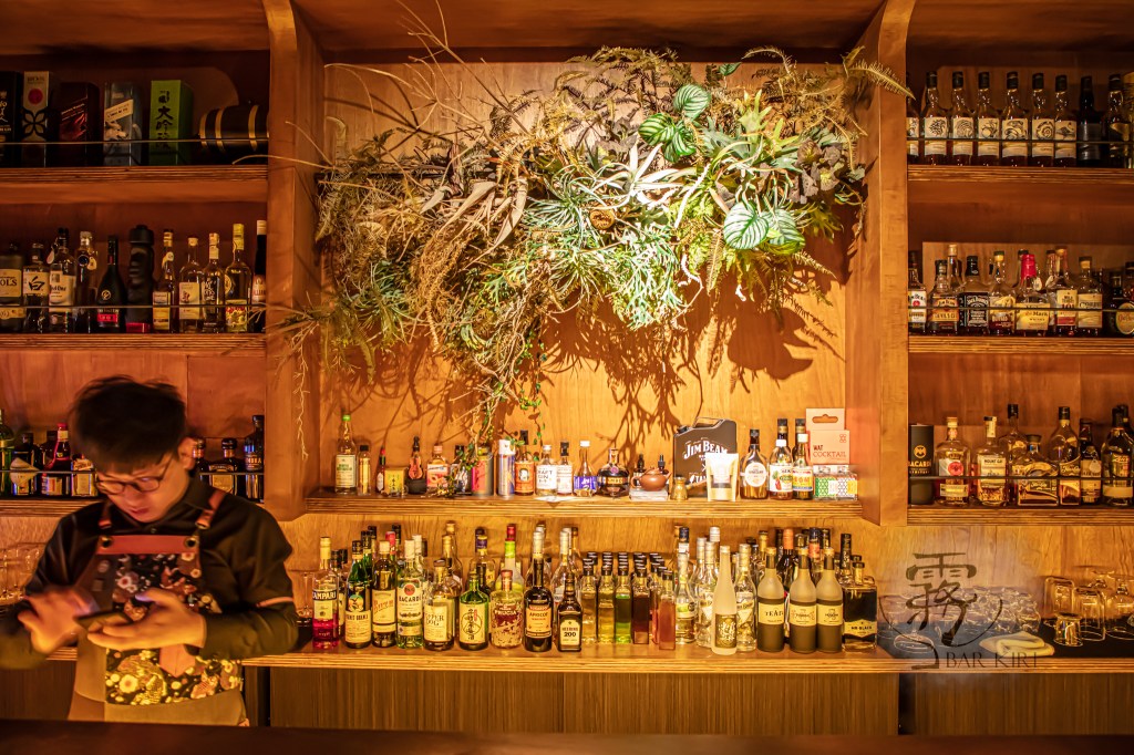 店面狹長,一側是吧檯,另一側則是雙人高腳雅座。吧檯的後方是一面滿滿的酒牆,這面酒牆的靈感來自日本BenFiddich,酒牆的正中央是由一大片植物裝飾著,給人一種氣派的感受,也是店內燈光最充足的一處。這些植物的下方以及左右空間,正是其他酒瓶的安身之處。