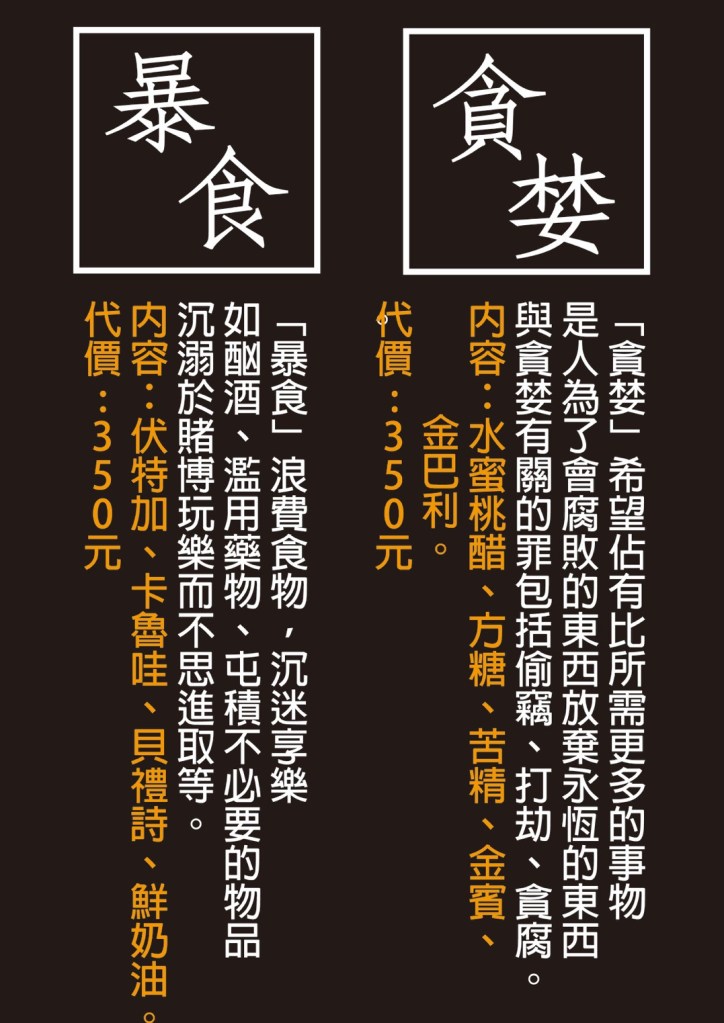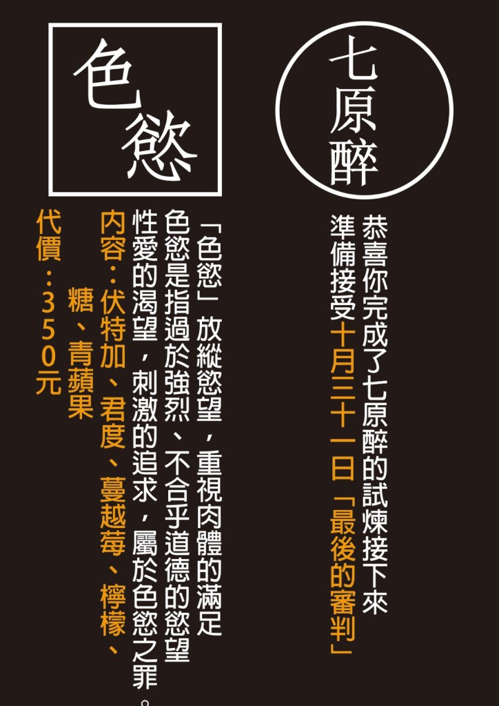 七宗罪裡的另一杯「憤怒」,火烤過的焦糖味配上杯口的鹽巴、橙酒的香氣從鼻而入,接著入口的是Tabasco辣椒醬的氣息;第二口從同一個位置喝下去以後,少了鹽巴的提味,Tabasco的風味更加明顯,憤怒的張力表露無遺,如同控制不住的脾氣,在嘴裡爆發後蔓延。而辣醬的味道會愈來愈明顯,第一口、第二口到最後一口,都有著相當不同的感受。不禁覺得讓人感受到店家即使是舉辦活動,也是灌注滿滿的心思,想讓大家感受到不同面貌的調酒,也感受七宗罪與五臟六腑的拉拔。