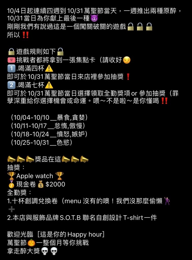 說到Happy hour,你會想到甚麼呢?以前,我會想著有便宜的酒可以喝了;而現在,我會想到在桃園市中壢區有這麼一家酒吧,叫做「這是你的Happy Hour」,推薦給你們。