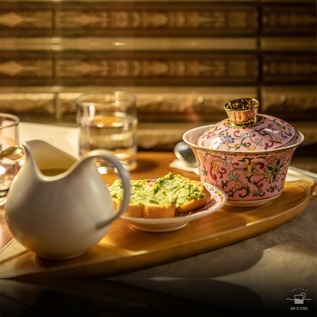 雲吧的空間帶有英式古典的風格,卻又點綴著中式的小物,甫入座,貼心的服務人員便往桌上的中式茶碗中注入熱水,上面的錠狀物,變成了溫熱的 Oshimori,提供我們暖手及清潔。