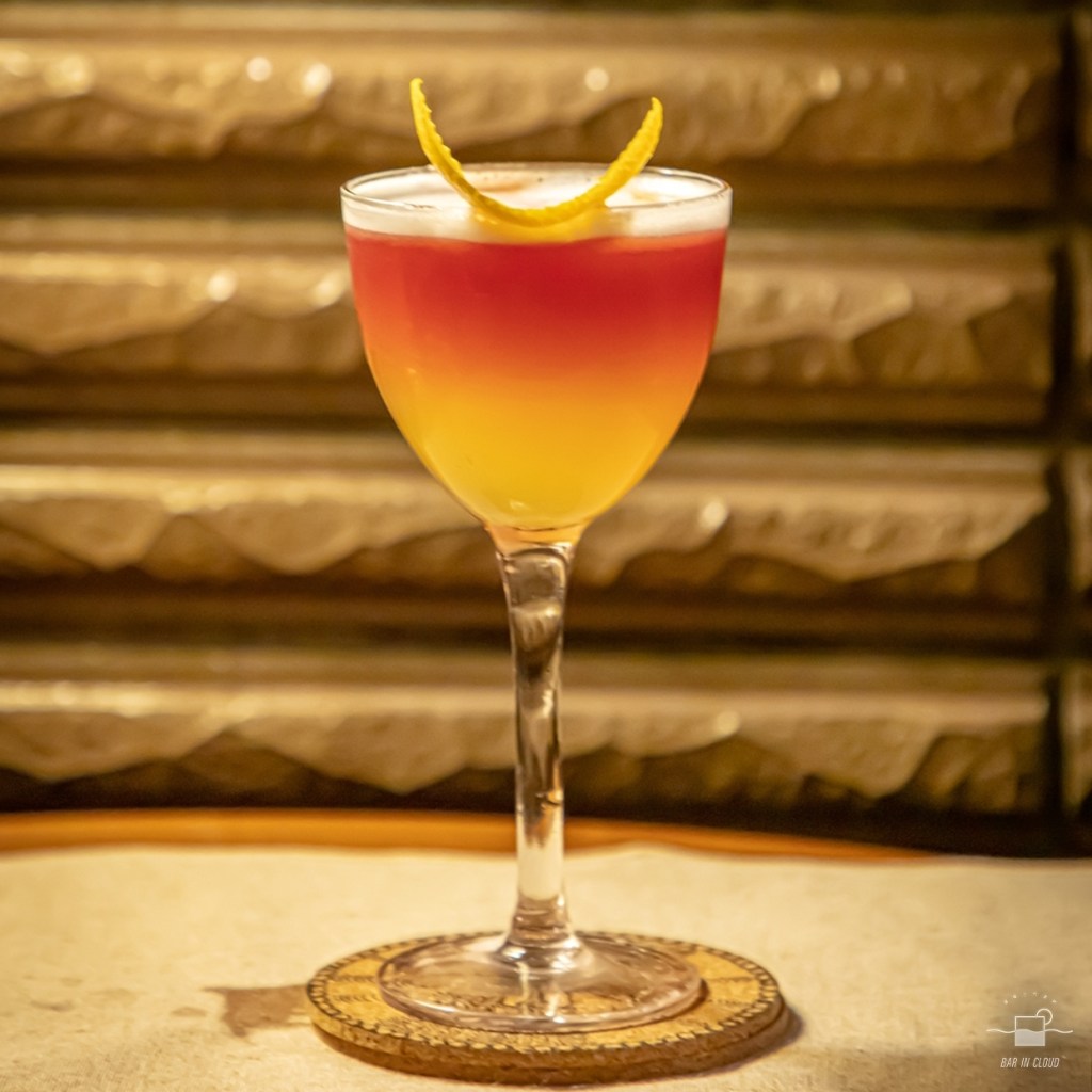 配合主餐的調酒,名叫「田風」,是以布萊迪波夏十年威士忌當作基底,紐約酸酒(New York Sour)的結構做改良,不添加蛋白,利用 SUZE 龍膽草酒和白可可利口酒,放大了波夏十年香草奶油和草原的風格,上層的黑皮諾紅酒,則與波夏十年的泥煤味共同媒合產生溫柔的炭焙烏梅香味,是杯不喜歡泥煤威士忌的人,也會喜愛的清爽調酒。