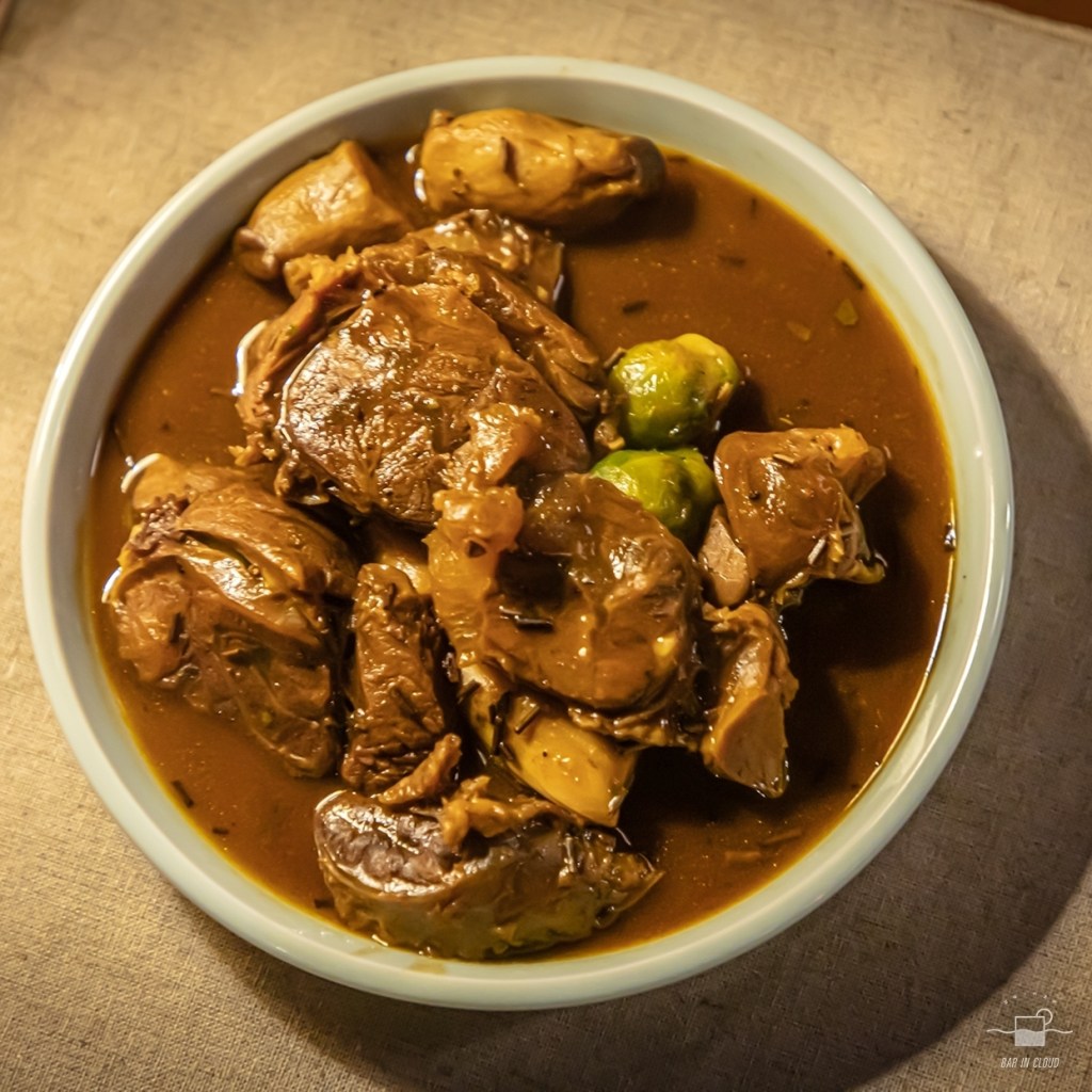 第二道主餐是使用巴拉圭牛腱製作的燉牛肉,搭配大阪黑門市場的焙茶以及辛香料,配菜則是小甘藍球和杏鮑菇,甘藍球略苦帶甜的風味與焙茶的甜香茶感非常契合,牛腱略帶口感,配合醬汁帶出豐厚的肉香。