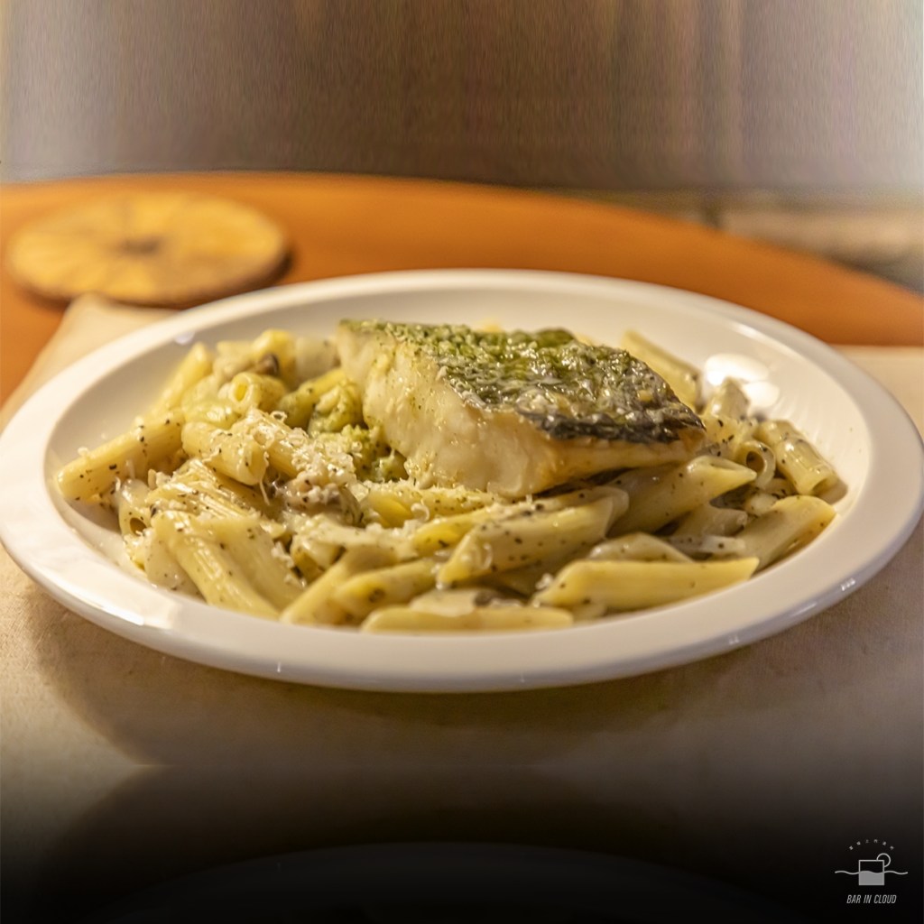 主餐的部分,則是抹茶鹽鱈魚佐北海道奶油松露醬筆管麵,以沖繩海鹽與日本靜岡抹茶,炒香後鋪上鱈魚排增添風味;麵體則是口感十足且容易吸附醬汁的筆管麵,搭配北海道奶油和義大利的松露醬,佐以多種不同的菇類增添口感。奶油松露濃郁的風味,以及筆管麵和菇菇營造的多層次口感,不論是風味和份量,都令人十分滿足。