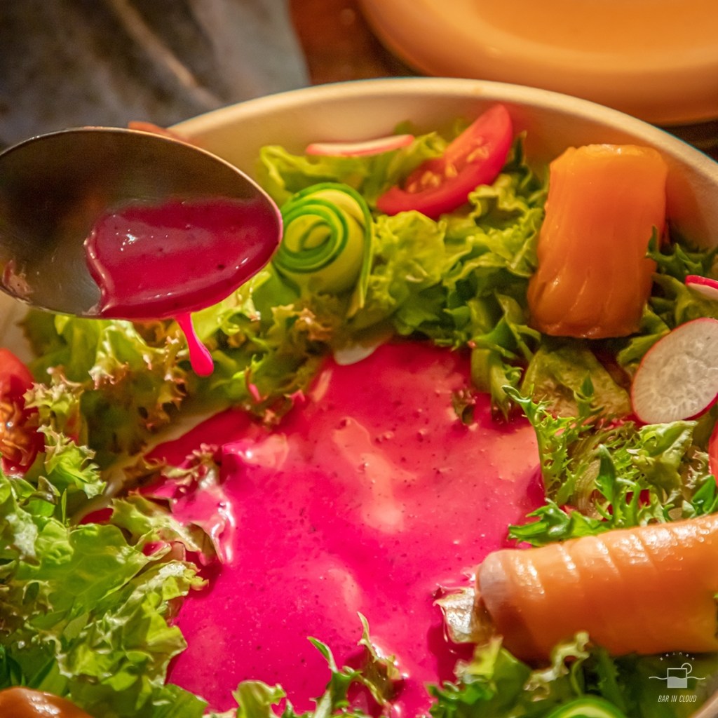 Beginning of Christmas 後,當然少不了精美的聖誕裝飾,所以下一道菜便是…聖誕花圈…。全名是燻鮭魚聖誕花圈沙拉, Bingo 選用來自桃園蘆竹農場的生菜葉,搭配以紅色火龍果沙拉醬,呈現聖誕夜的兩大主要配色,最後裝飾上鮭魚捲當作餐點的主角。