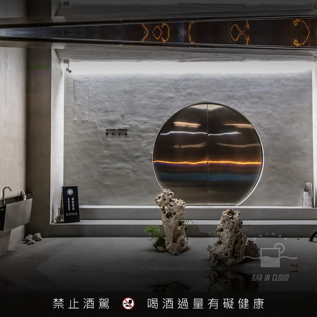 這是家充滿禪意的酒吧!入門的開關隱藏在玄關左側的洗手台中,必須要洗去俗世的塵擾,才會開啟進入無心之心的金屬大門。金屬中島的吧台的後方,有一顆皎潔的圓月,四周環繞清水模抹平的牆面。現代摩登的金屬元素搭配如同月球般簡潔的空間,彷彿置身電影「第五元素」中的太空船中,赫然發現原來那如同明月的球狀物並非月球,而是我們故鄉的地球,下方是代表海洋的淡藍色,中層是遠方的雲朵,上層則是太陽將厚重的雲層渲染成金黃色。